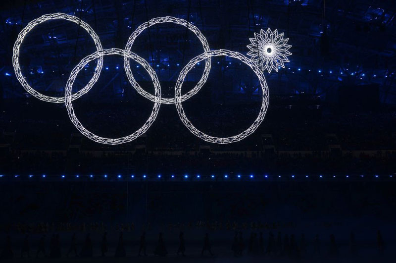 Four of the five Olympic Rings are seen lit up at the start of the opening ceremony of the 2014 Sochi Winter Olympics, February 7, 2014.
