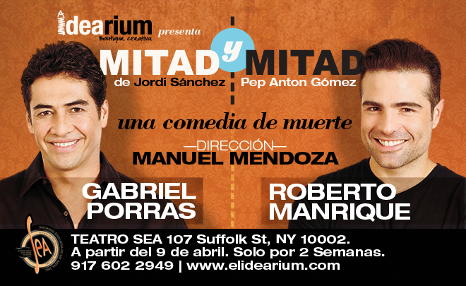 New York, NY - After the great success received in theaters in Miami, the dark comedy “Mitad y Mitad” written by Jordi Gómez Sánchez and Pep Anton reaches the New York theater productions this season. Starring Gabriel Porras and Roberto Manrique, two charismatic and talented actors from telenovelas, and directed by Venezuelan Manuel Mendoza, “Mitad y Mitad” will be showcased at Teatro SEA starting April 9 and will serve as the launch of the campaign's conquest, which will bring to the Big Apple plays such as Toc-Toc, Taxi, Confessions of the Penis and Vagina Monologues.